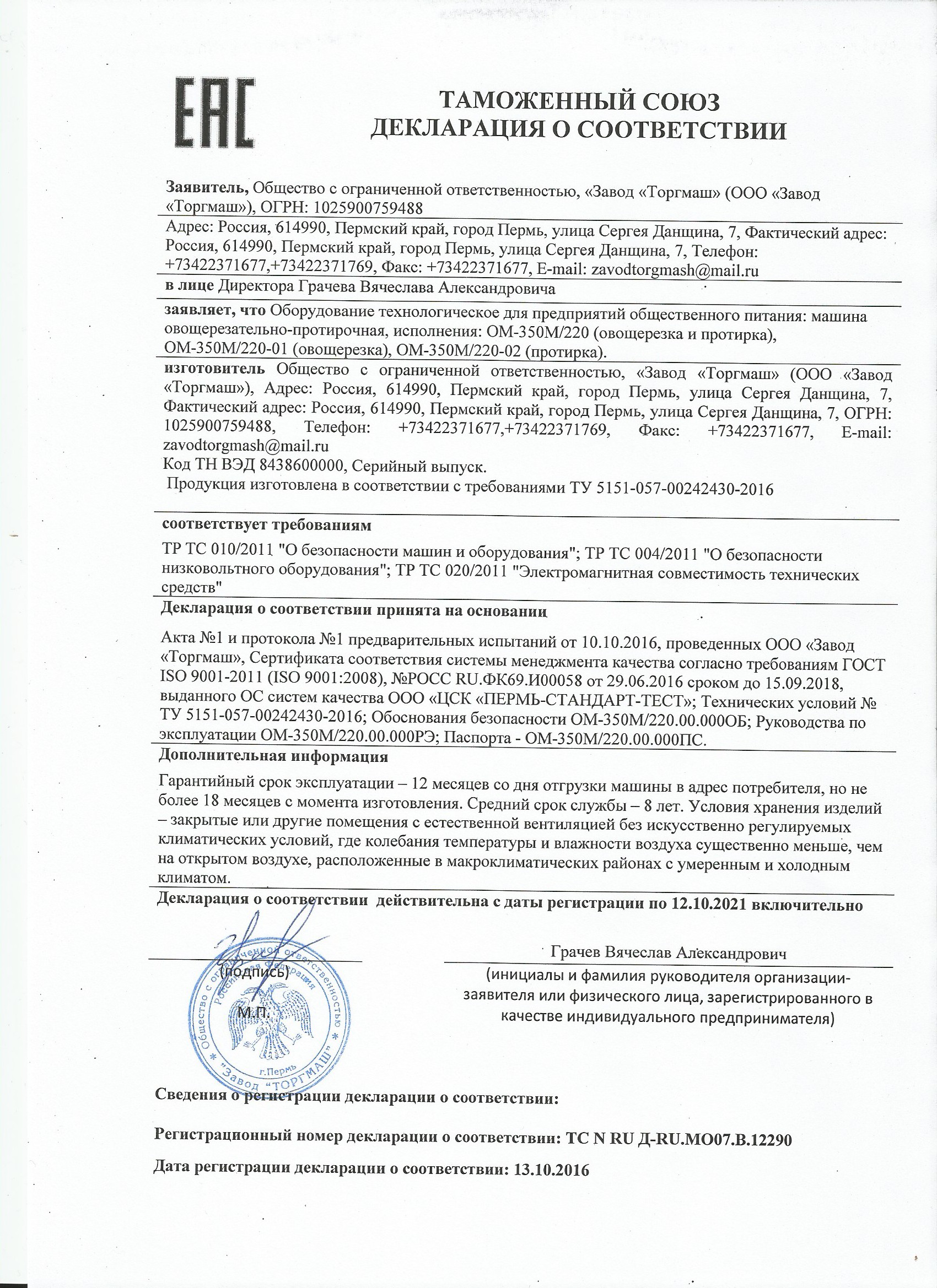 Овощерезательно-протирочная машина ТОРГМАШ ОМ-350М используется на предприятиях общественного питания и торговли для нарезания сырых и вареных овощей, шинковки капусты и протирания овощей, фруктов и творога. Корпус выполнен из стали с покрытием порошковой краской, ножи и диски - из нержавеющей стали.