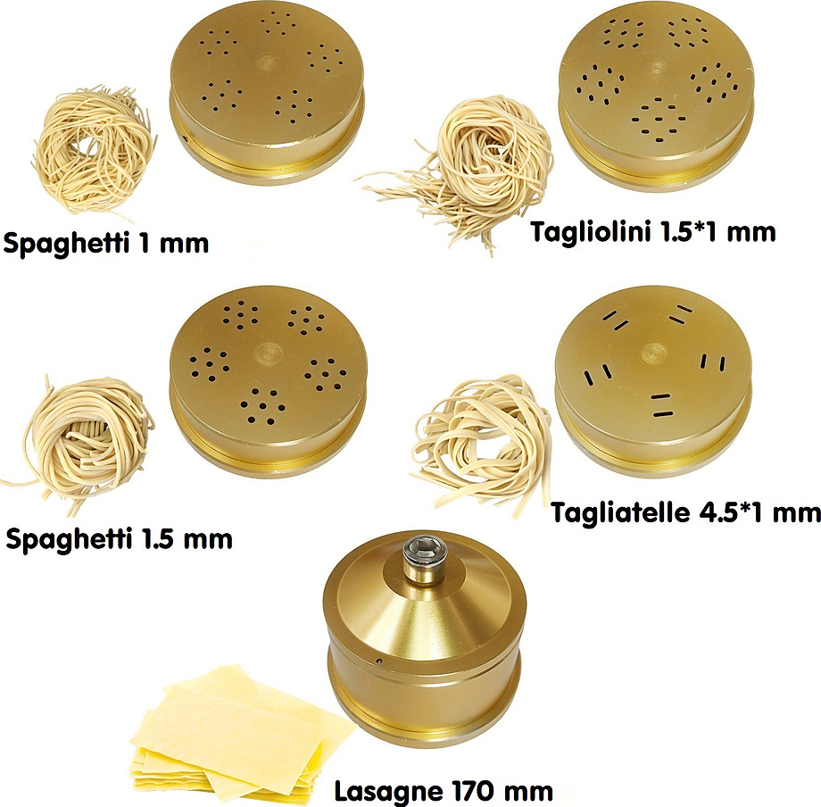 В комплект поставки входят 5 фильер из алюминия с бронзовым покрытием для приготовления Spaghetti шириной 1 и 1,5 мм, Tagliolini 1,5*1 мм, Tagliatelle 4,5*1 мм, листа теста Lasagne шириной до 170 мм, мерный стакан, ключ для простой замены фильер.