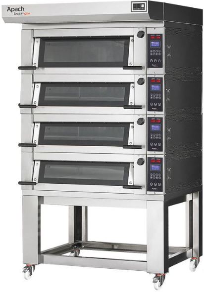 Печь подовая Apach Bakery Line E4LK3L DPBI-T серии E используется на предприятиях общественного питания, торговли, пищевых производствах, в пекарнях и кондитерских для приготовления различных блюд, выпечки хлебобулочных и кондитерских изделий. Модель оборудована цифровым управлением с раздельным контролем температур: верх/низ/фрон, вытяжкой пара, независимым парогенератором на каждый под, соединительным комплектом для воды и электричества, дверьми со смотровым окном и подставкой на колесах. Материал козырька, подставки и корпуса - высококачественная нержавеющая сталь, материал основания - цементный агломерат с металлическим каркасом, материал теплоизоляции - минеральная вата.