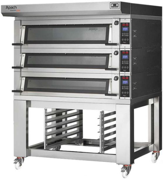 Печь подовая Apach Bakery Line E4LK2S DPBI-T серии E используется на предприятиях общественного питания, торговли, пищевых производствах, в пекарнях и кондитерских для приготовления различных блюд, выпечки хлебобулочных и кондитерских изделий. Модель оборудована цифровым управлением с раздельным контролем температур: верх/низ/фронт, вытяжкой пара, независимым парогенератором на каждый под, соединительным комплектом для воды и электричества, дверьми со смотровым окном и подставкой на колесах. Материал козырька, подставки и корпуса - высококачественная нержавеющая сталь, материал основания - цементный агломерат с металлическим каркасом, материал теплоизоляции - минеральная вата.