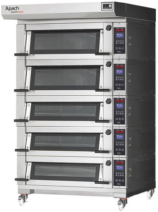 Печь подовая Apach Bakery Line E4LK8LHSE DP серии E используется на предприятиях общественного питания, торговли, пищевых производствах, в пекарнях и кондитерских для приготовления различных блюд, выпечки хлебобулочных и кондитерских изделий. Модель оборудована цифровым управлением с раздельным контролем температур: верх/низ/фронт, вытяжкой пара, независимым парогенератором на каждый под, соединительным комплектом для воды и электричества, дверьми со смотровым окном и подставкой на колесах. Материал козырька, подставки и корпуса - высококачественная нержавеющая сталь, материал основания - цементный агломерат с металлическим каркасом, материал теплоизоляции - минеральная вата.