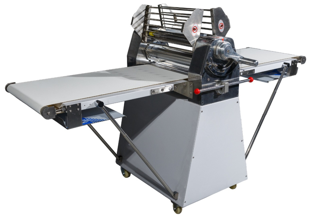 Автоматическая тестораскаточная машина Hualian YP-520 NEW используется на предприятиях общественного питания, торговли и пищевых производствах для раскатки песочного, слоеного, пресного и крутого теста. Модель оснащена ограничительной пластиной, транспортерной лентой, валом привода транспортера, защитным рычагом, бункером для муки, позиционным фиксатором вала, ручкой регулировки зазора, индикатором питания, переключателем запуска и остановки и выключателем питания. Материал корпуса - крашенный металл.