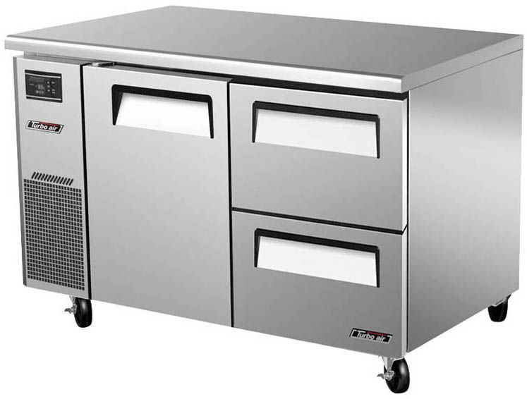 Холодильный стол Turbo air KUR12-2D-2предназначен для раскатки теста, обработки, охлаждения и кратковременного хранения продуктов и напитков на предприятиях общественного питания и торговли. Корпус выполнен из нержавеющей стали (гальванизированная сталь на оборотной стороне и внизу) с применением пожаробезопасных стенок толщиной 60 мм, уплотнения - из АБС-пластика (акрилонитрилбутадиенстирола), не пропускающего конденсата, пол - из нержавеющей стали с алюминиевыми вставками по бокам и сзади оборудования, тройные направляющие - из высококачественной нержавеющей стали.