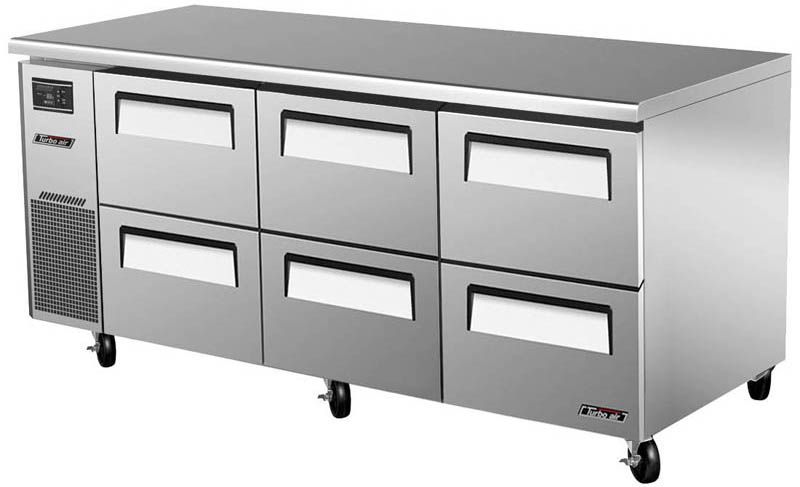 Холодильный стол Turbo air KUR18-2D-6 предназначен для раскатки теста, обработки, охлаждения и кратковременного хранения продуктов и напитков на предприятиях общественного питания и торговли. Корпус выполнен из нержавеющей стали (гальванизированная сталь на оборотной стороне и внизу) с применением пожаробезопасных стенок толщиной 60 мм, уплотнения - из АБС-пластика (акрилонитрилбутадиенстирола), не пропускающего конденсата, пол - из нержавеющей стали с алюминиевыми вставками по бокам и сзади оборудования, тройные направляющие - из высококачественной нержавеющей стали.