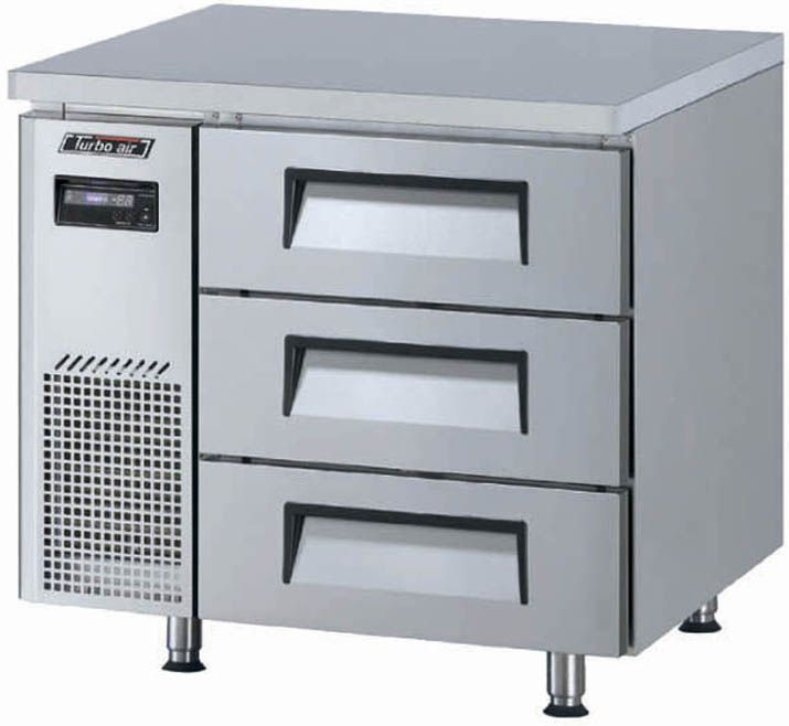 Холодильный стол Turbo air KUR9-3D-3 предназначен для раскатки теста, обработки, охлаждения и кратковременного хранения продуктов и напитков на предприятиях общественного питания и торговли. Корпус выполнен из нержавеющей стали (гальванизированная сталь на оборотной стороне и внизу) с применением пожаробезопасных стенок толщиной 60 мм, уплотнения - из АБС-пластика (акрилонитрилбутадиенстирола), не пропускающего конденсата, пол - из нержавеющей стали с алюминиевыми вставками по бокам и сзади оборудования, тройные направляющие - из высококачественной нержавеющей стали.
