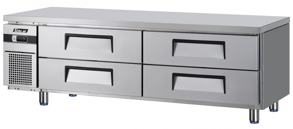 Холодильный стол Turbo air KUC18-4 предназначен для хранения овощей, полуфабрикатов из мяса и рыбы, а так же других скоропортящихся продуктов на предприятиях общественного предприятия и торговли. Сверхпрочная столешница шеф-базы изготовлена из цельного куска нержавеющей стали для повышения прочности. За счет использования специального слоя теплоизоляции на столешницу можно устанавливать любое тепловое оборудование. Столешницы этой модели выдерживают до 650 кг нагрузки. Шеф-база Turbo Air спроектирована с увеличенной и более сбалансированной (CFC free) системой охлаждения. Она включает в себя более мощный испаритель и конденсатор, обладающие большой эффективностью и позволяющие добиться быстрого охлаждения продуктов.