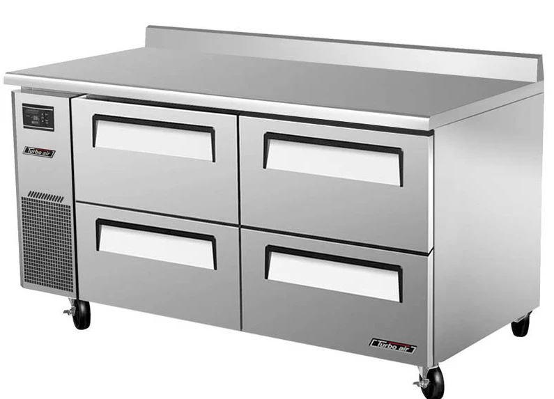 Холодильный стол Turbo air KWR15-2D-4-700 используется для охлаждения, заморозки и длительного хранения пищевых продуктов, а также для обработки ингредиентов на предприятиях общественного питания, торговли и пищевых производствах. Динамическая система охлаждения. Стол установлен на 4 колесах, оснащен 4 ящиками. Материал корпуса, ножек и направляющих - нержавеющая сталь, материал задней и нижней панелей - гальванизированная сталь, материал пола - нержавеющая сталь с алюминиевыми вставками, материал полок - толстая стальная проволока с виниловым покрытием, материал уплотнения - ABS-пластик.