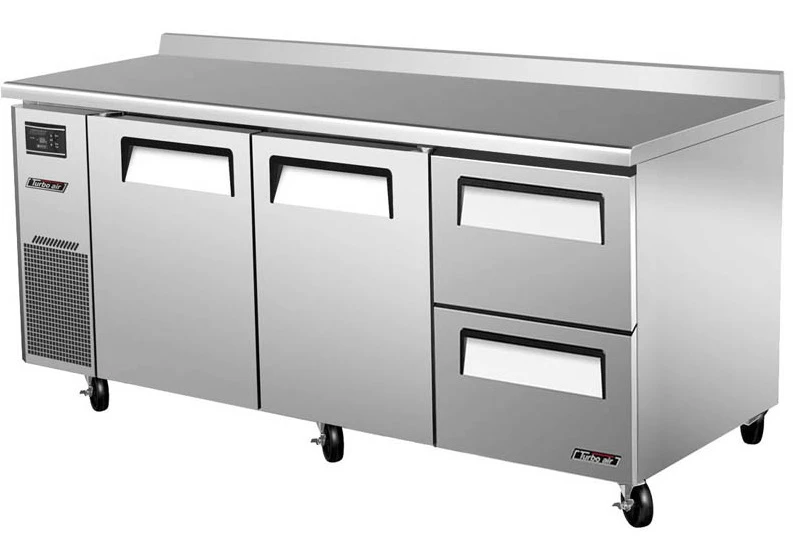 Холодильный стол Turbo air KWR18-2D-2-750 используется для охлаждения, заморозки и длительного хранения пищевых продуктов, а также для обработки ингредиентов на предприятиях общественного питания, торговли и пищевых производствах. Динамическая система охлаждения. Стол установлен на 6 колесах, оснащен 2 дверьми, 2 полками и 3 ящиками. Материал корпуса и направляющих - нержавеющая сталь, материал задней и нижней панелей - гальванизированная сталь, материал пола - нержавеющая сталь с алюминиевыми вставками, материал полок - толстая стальная проволока с виниловым покрытием, материал уплотнения - ABS-пластик.