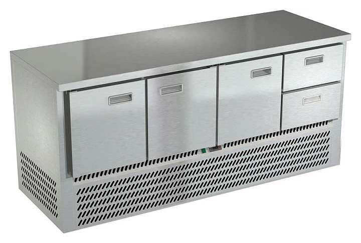 Холодильный стол Техно-ТТ СПН/О-122/32-1907 предназначается для раскатки теста, обработки, охлаждения и кратковременного хранения продуктов и напитков на предприятиях общественного питания, торговли и пищевых производствах. Секции оснащены направляющими и решетчатыми полками, двери и ящики - доводчиками. Материал корпуса и столешницы - нержавеющая сталь AISI 430, материал задней панели и дна - оцинкованная сталь.