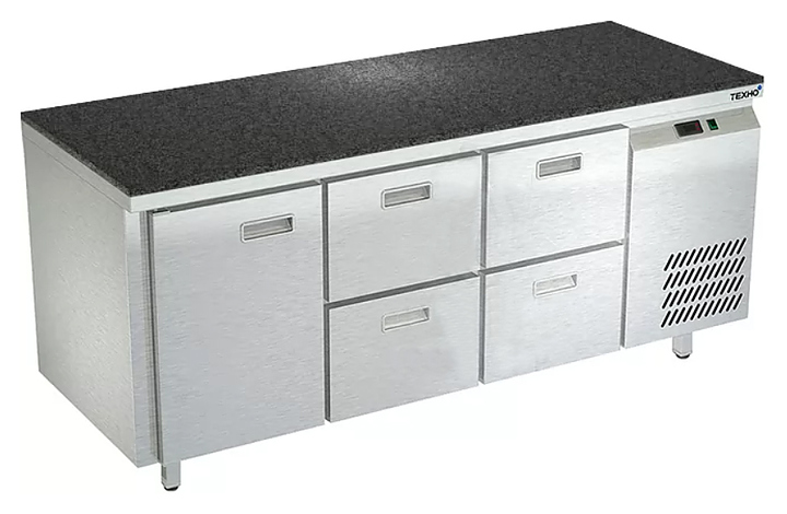Холодильный стол Техно-ТТ СПБ/О-322/14-1806 предназначается для раскатки теста, обработки, охлаждения и кратковременного хранения продуктов и напитков на предприятиях общественного питания, торговли и пищевых производствах. Секции оснащены направляющими и ящиками с доводчиками. Материал корпуса - нержавеющая сталь AISI 430, материал столешницы - гранит (толщина 20 мм), материал задней панели и дна - оцинкованная сталь.