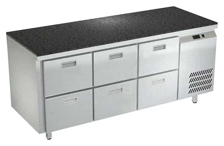 Холодильный стол Техно-ТТ СПБ/О-323/06-1807 предназначается для раскатки теста, обработки, охлаждения и кратковременного хранения продуктов и напитков на предприятиях общественного питания, торговли и пищевых производствах. Секции оснащены направляющими и ящиками с доводчиками. Материал корпуса - нержавеющая сталь AISI 430, материал столешницы - гранит (толщина 20 мм), материал задней панели и дна - оцинкованная сталь.