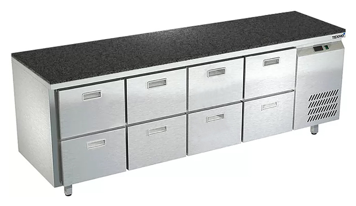 Холодильный стол Техно-ТТ СПБ/О-323/08-2207 предназначается для раскатки теста, обработки, охлаждения и кратковременного хранения продуктов и напитков на предприятиях общественного питания, торговли и пищевых производствах. Секции оснащены направляющими и ящиками с доводчиками. Материал корпуса - нержавеющая сталь AISI 430, материал столешницы - гранит (толщина 20 мм), материал задней панели и дна - оцинкованная сталь.