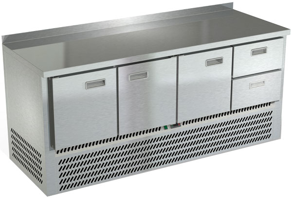 Холодильный стол Техно-ТТ СПН/О-222/32-1907 предназначается для раскатки теста, обработки, охлаждения и кратковременного хранения продуктов и напитков на предприятиях общественного питания, торговли и пищевых производствах. Секции оснащены направляющими и ящиками с доводчиками. Материал корпуса и столешницы - нержавеющая сталь AISI 430, материал задней панели и дна - оцинкованная сталь.