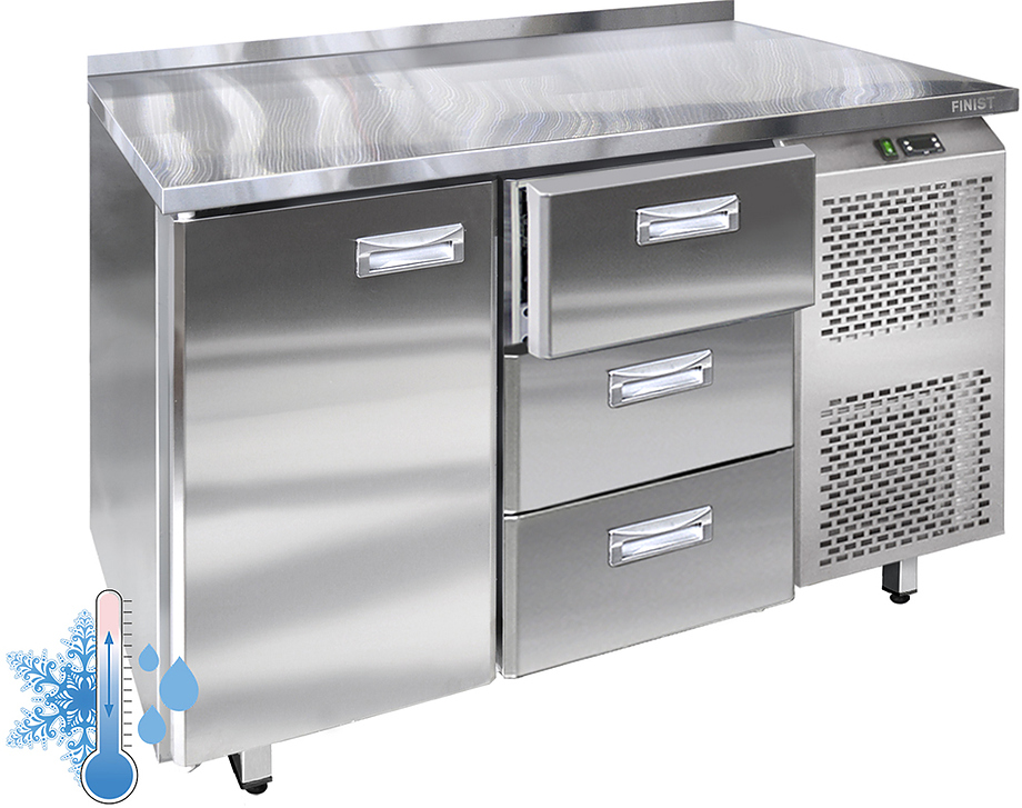 Холодильный стол Finist УХС-600-1/3 используется на предприятиях общественного питания, торговли и пищевых производствах для хранения и обработки полуфабрикатов из мяса и рыбы, заготовок для салата, охлажденных напитков и прочих пищевых продуктов. Управление при помощи кнопочной панели управления, оснащенной цифровым дисплеем. 1 холодильная камера с распашными дверцами, 1 секция с 3 выдвижными ящиками с доводчиками, агрегатный отсек располагается сбоку. Стол установлен на ножки с подпятниками. Материал корпуса - нержавеющая сталь.