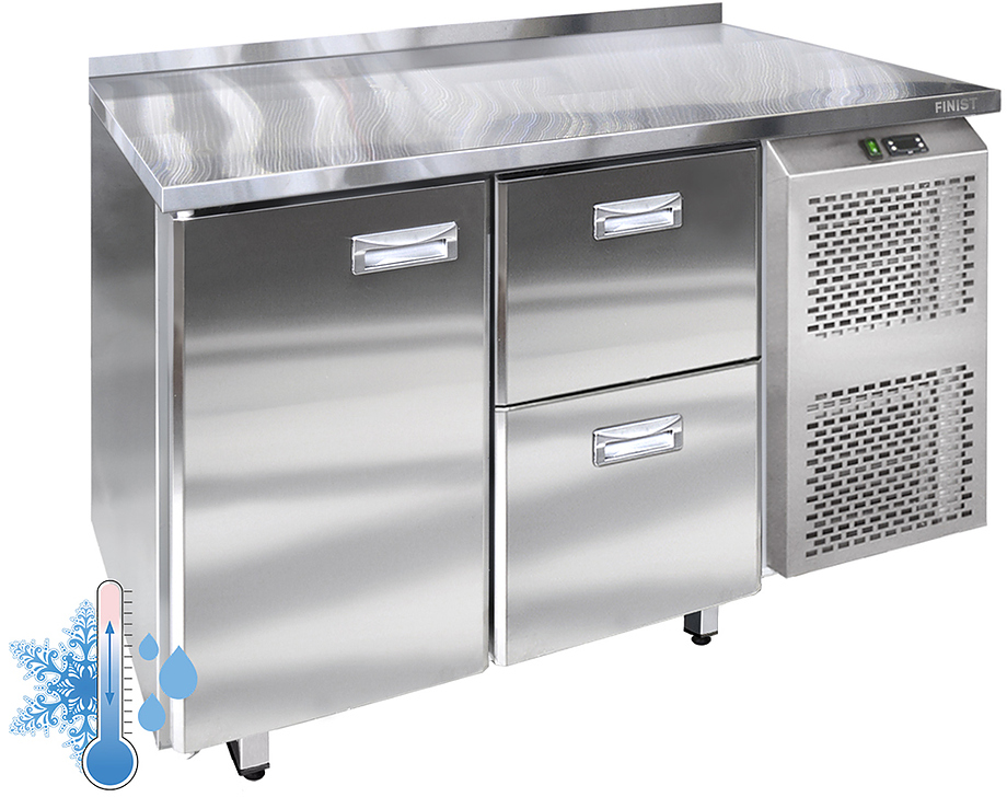 Холодильный стол Finist УХС-700-1/2 используется на предприятиях общественного питания, торговли и пищевых производствах для хранения и обработки полуфабрикатов из мяса и рыбы, заготовок для салата, охлажденных напитков и прочих пищевых продуктов. Управление при помощи кнопочной панели управления, оснащенной цифровым дисплеем. 1 холодильная камера с распашными дверцами, 1 секция с 2 выдвижными ящиками с доводчиками, агрегатный отсек располагается сбоку. Стол установлен на ножки с подпятниками. Материал корпуса - нержавеющая сталь.