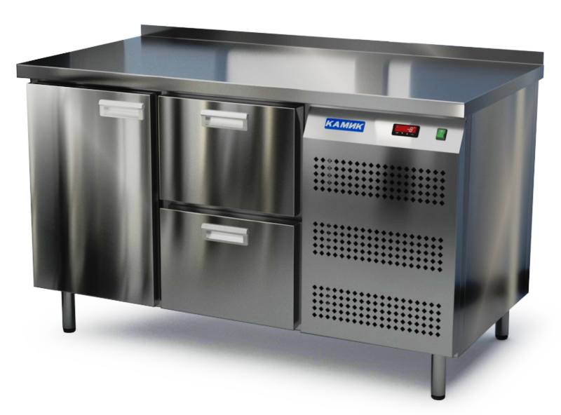 Холодильный стол КАМИК СО-12146 используется на предприятиях общественного питания и торговли для охлаждения и хранения продуктов, напитков и готовых блюд. Конструкция разделена на секции, каждая из которых оборудована сетчатой полкой и парой направляющих. Корпус выполнен из нержавеющей стали AISI 430 толщиной 1 мм, столешница - из нержавеющей стали AISI 304 толщиной 1,5 мм.