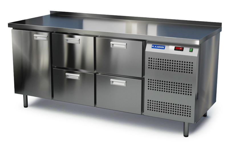 Холодильный стол КАМИК СО-Т-141856 используется на предприятиях общественного питания и торговли для охлаждения и хранения продуктов, напитков и готовых блюд, а также для установки теплового оборудования на него. Конструкция разделена на секции, каждая из которых оборудована сетчатой полкой и парой направляющих. Корпус выполнен из нержавеющей стали.