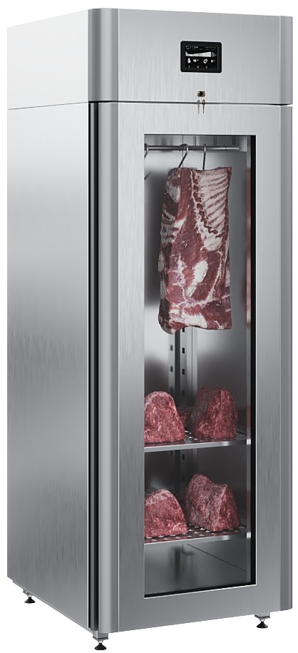 POLAIR CS107 Meat используется на предприятиях общественного питания, торговли и пищевых производствах для приготовления и хранения салями, сыровяленых колбас и прочих мясных деликатесов. шкаф оснащен штангой для подвеса мяса и 2 перфорированными полками, внутренней подсветкой и рассчитан на работу при температуре окружающей среды до 40 °С. Аппарат оснащен встроенным увлажнителем и должен был подключен к системе подачи воды с обязательной водоочисткой и центральной канализации. Материал корпуса - нержавеющая сталь, материал двери - стеклопакет.