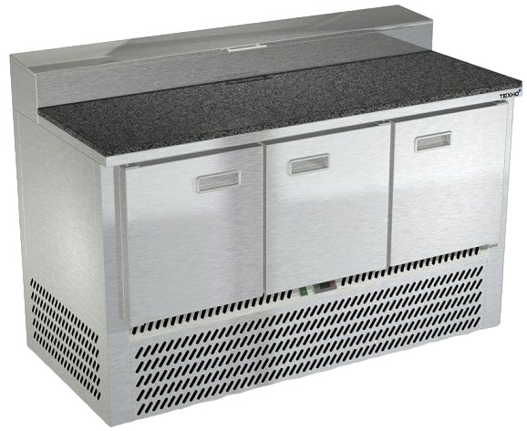 Холодильный стол Техно-ТТ СПН/П-327/30-1407 используется на предприятиях общественного питания, торговли и пищевых производствах для обработки ингредиентов, используемых для приготовления пиццы, а также охлаждения и кратковременного хранения продукции. Каждая секция оснащена сетчатой полкой и направляющими, двери оснащены доводчиками (пр-во Польша). Материал корпуса - нержавеющая сталь AISI 430, материал столешницы - гранитная крошка (толщина 20 мм), материал дна и задней панели - оцинкованная сталь.