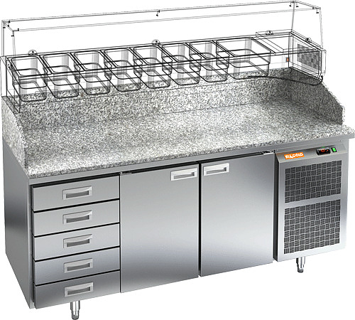 Стол для пиццы HICOLD PZ4-11/GN используется на предприятиях общественного питания, торговли и пищевых производствах для раскатки теста и обработки ингредиентов, используемых для приготовления пиццы, салатов и других блюд, а также для охлаждения и кратковременного хранения скоропортящихся продуктов и напитков. Модель совмещает в себе рабочую поверхность и охлаждаемый объем, что значительно упрощает работу повара, так как все необходимые компоненты всегда находятся под рукой. Материал корпуса - нержавеющая сталь, материал столешницы - гранит.