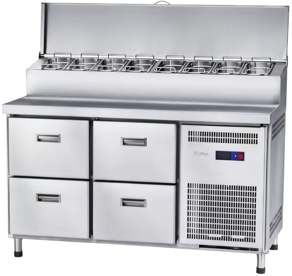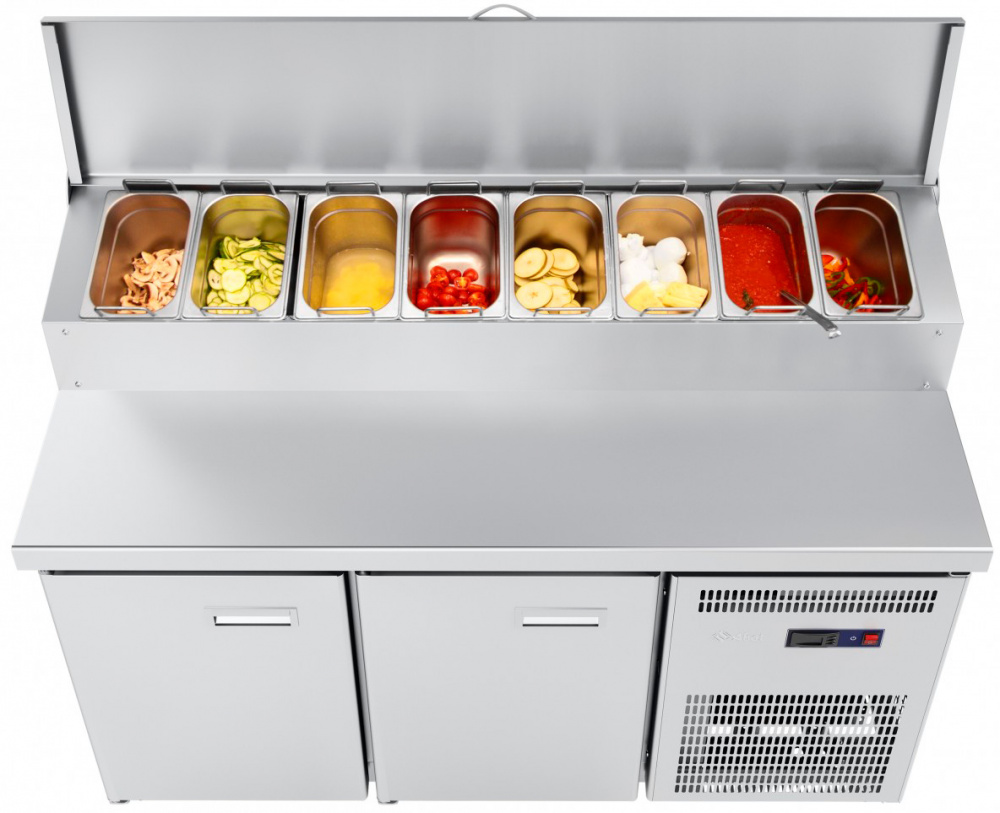 Стол для пиццы Abat СХС-80-01П предназначен для раскатки теста, обработки ингредиентов для приготовления блюд, заморозки и хранения продуктов на предприятиях общественного питания и торговли. Модель оснащена электронным блоком управления, автоматической оттайкой и регулируемыми ножками. Материал изделия - высококачественная нержавеющая сталь, материал теплоизоляции - пенополиуретан.