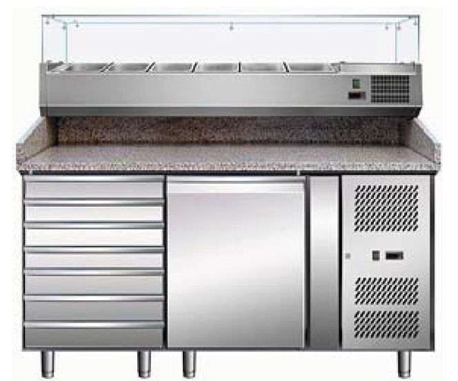 Холодильный стол для пиццы Koreco SPZ 1610 TN используется на предприятиях общественного питания и торговли для раскатки теста и обработки ингредиентов для приготовления пиццы, охлаждения и кратковременного хранения скоропортящихся продуктов и напитков. Корпус выполнен из нержавеющей стали AISI 304, бортик - из гранита.