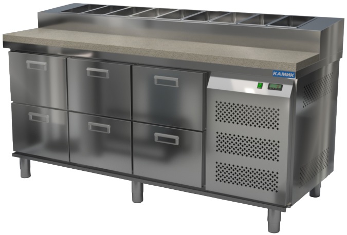 Холодильный стол КАМИК СОП-0618573К используется на предприятиях общественного питания и торговли для охлаждения и хранения продуктов, напитков и готовых блюд, а также для раскатки теста и обработки ингредиентов для приготовления пиццы. Конструкция разделена на секции, каждая из которых оборудована сетчатой полкой и парой направляющих. Корпус выполнен из нержавеющей стали AISI 430 толщиной 1 мм, столешница - из нержавеющей стали AISI 304 толщиной 1 мм.