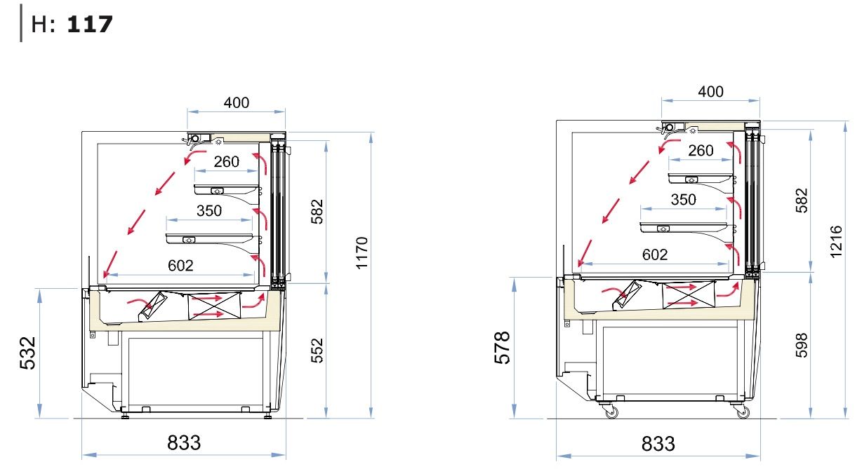 Модель оснащена распашными дверцами со стороны оператора, что позволяет изолировать охлаждаемый объем от проникновения внешнего тепла. Каркас и основание витрины, а также передняя техническая панель изготовлены из углеродистой стали, окрашенной порошковой краской, зона выкладки, рабочая поверхность, задняя панель, передняя нижняя решётка, кронштейны полок и перфорированные стойки для фиксации кронштейнов на разной высоте - из нержавеющей стали. Цельный корпус имеет изоляцию из пенополиуретана, вспененного углекислотой, без использования озоноразрушающих веществ.