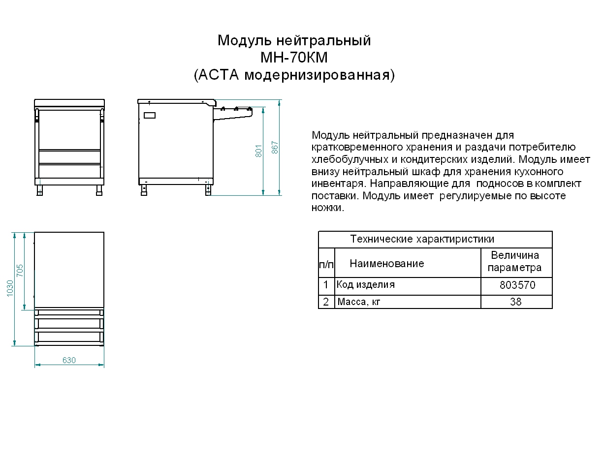 Нейтральный модуль Abat МН-70КМ предназначен для выкладки хлебобулочных, кондитерских изделий, посуды и столовых приборов в составе линий раздач на предприятиях общественного питания и торговли. Ножки регулируются по высоте. Материал изделия - нержавеющая сталь.