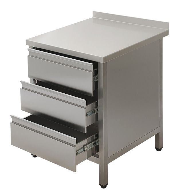 Simeco СЗE0706БЯ используется на предприятиях общественного питания и торговли для приготовления различных блюд, а так же для хранения посуды, сыпучих продуктов и специй. Модель закрыта с трех сторон. Имеет 3 выдвижных ящика из нержавеющей стали. Каркас стола выполнен из нержавеющей стали AISI 430, столешница - из нержавеющей стали AISI 430. Ножки - труба 40х40 мм.
