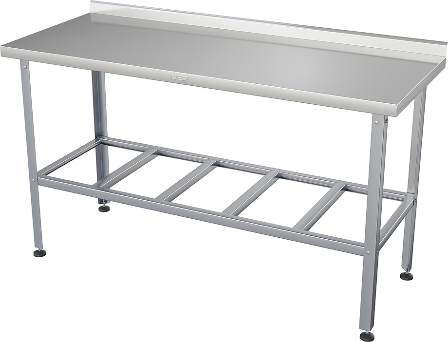 Производственный стол ATESY СР-С-1-1800.600-02 серии Стандарт предназначен для раскатки теста и обработки ингредиентов на предприятиях общественного питания и торговли. Полка-решетка и каркас выполнены из оцинкованной стали толщиной 1,2 мм, столешница - из нержавеющей стали AISI 430 толщиной 0,8 мм, ножки - из нержавеющей стали, опора ножек - из пластика.