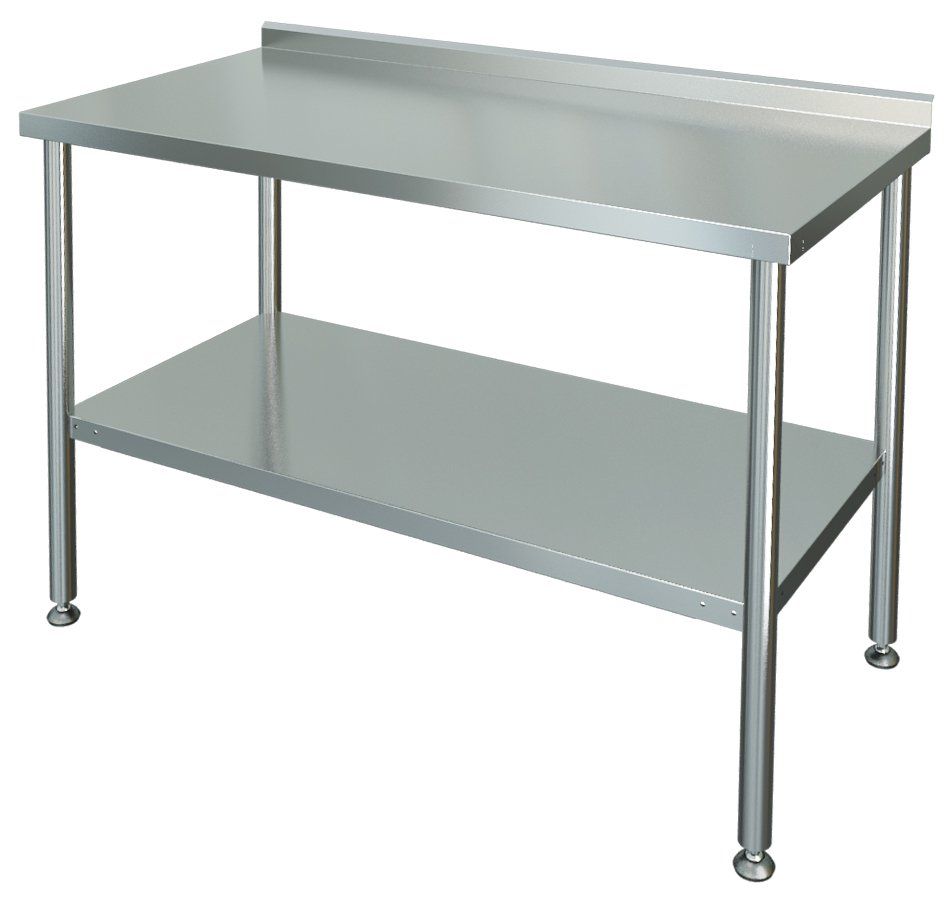 Столешница стола, усиленная подложкой из ЛДСП толщиной 15 мм,выполнена из нержавеющей стали AISI 430 толщиной 0,5 мм, каркас - из оцинкованного уголка толщиной 1+1 мм, ножки с регулиремыми опорами - из оцинкованного стального уголка 40х40 мм с подгибом краёв во внутрь толщиной 1,0 мм. Изделие оснащено практичной сплошной полкой из нержавеющей стали и одним бортом.