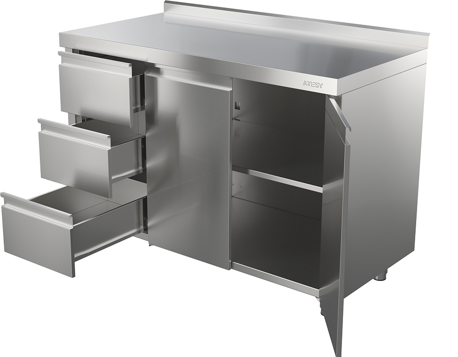 Производственный стол ATESY СТ-С-1-1500.600-02-Р-3Л используется на предприятиях общественного питания, торговли и пищевых производствах для разделывания и обработки пищевых продуктов, а также в качестве вспомогательной поверхности для кухонного оборудования и места хранения кухонной посуды, инвентаря и сухих продуктов. Стол оснащен 1 полкой, 3 выдвижными ящиками, 2 распашными дверцами и бортом. Столешница, двери и боковые панели выполнены из нержавеющей стали AISI 430, дно и задняя стенка - из оцинкованной стали, ножки - из нержавеющей стали с пластиковой опорной частью, столешница укреплена с внутренней стороны листом ламинированной древесно-стружечной плиты.