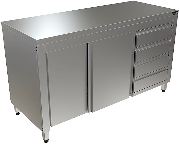 Стол производственный Кобор СТ/1-150/70/К используется на предприятиях общественного питания, торговли и пищевых производствах для хранения кухонной утвари и обработки различных ингредиентов перед приготовлением. Материал каркаса - высококачественная нержавеющая сталь (труба 40х40 мм), материал столешницы - высококачественная нержавеющая сталь AISI 430, усиленная листом ЛДСП (толщина 16 мм).
