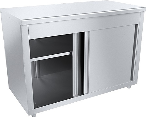 Стол-тумба Пищевые Технологии СТ-К-15/7СНК используется на предприятиях общественного питания, торговли и пищевых производствах для обработки ингредиентов, приготовления различных блюд и хранения кухонного инвентаря. Модель оснащена дверьми-купе, сплошной полкой и регулируемыми ножками. Материал каркаса и столешницы - высококачественная нержавеющая сталь AISI 430 с усиленным листом ЛДСП, материал полки - нержавеющая сталь с усиленным профилем, материал задней стенки - оцинкованная сталь.