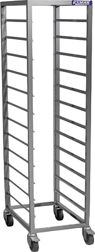 Тележка-шпилька КАМИК Шп-41014661пр используется на предприятиях общественного питания и торговли для временного хранения и транспортировки полуфабрикатов и готовой продукции, а также в процессе работы с пекарскими и расстоечными шкафами. Модель оснащена 4 прорезиненными поворотными колесами, 2 из которых оборудованы тормозами. Конструкция выполнена из нержавеющей стали AISI 430.