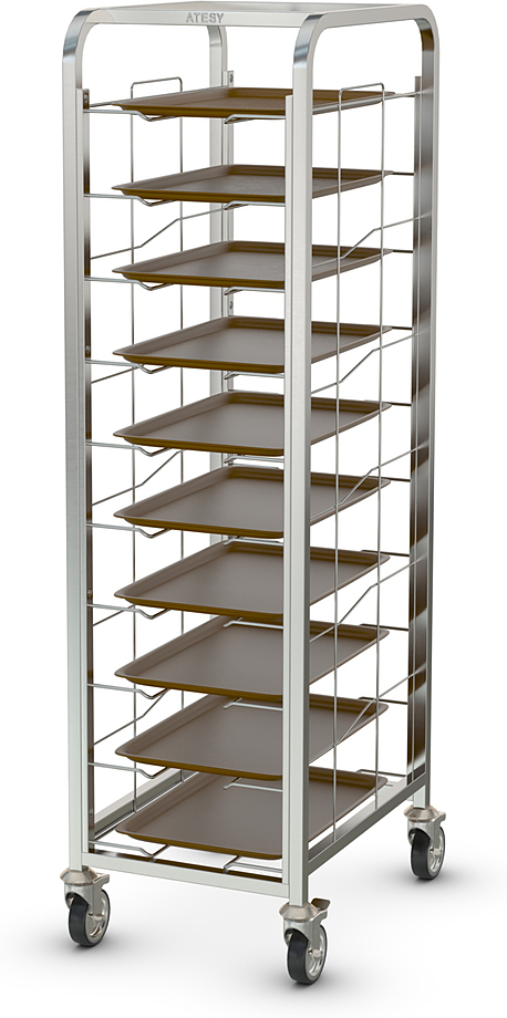 Тележка-шпилька ATESY КШП-Л-1.10-350.600-02 серии Люкс предназначается для временного хранения и перемещения противней между линиями раздачи готовых блюд и кухней на предприятиях общественного питания, торговли и пищевых производствах. Тележка оснащена 4 поворотными колесами (2 с тормозами), кромками с безопасным подгибом. Тип конструкции - сварная, стойки из труб квадратного сечения. Материал конструкции - нержавеющая сталь AISI 304.