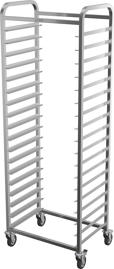 Тележка-шпилька ATESY КШ-Л-1.18-600.400-02 серии Люкс предназначается для временного хранения и перемещения гастроемкостей между линиями раздачи готовых блюд и кухней на предприятиях общественного питания, торговли и пищевых производствах. Тележка оснащена 4 поворотными колесами (2 с тормозами), кромками с безопасным подгибом. Тип конструкции - сварная, стойки из труб квадратного сечения. Материал конструкции - нержавеющая сталь AISI 304.