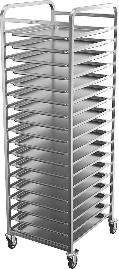 Тележка-шпилька ATESY КШ-С-1.18-2.1-02 серии Стандарт предназначается для временного хранения и перемещения гастроемкостей между линиями раздачи готовых блюд и кухней на предприятиях общественного питания, торговли и пищевых производствах. Тележка оснащена 4 поворотными колесами (2 с тормозами), кромками с безопасным подгибом. Тип конструкции - сварная, стойки из труб квадратного сечения. Материал конструкции - нержавеющая сталь AISI 304.