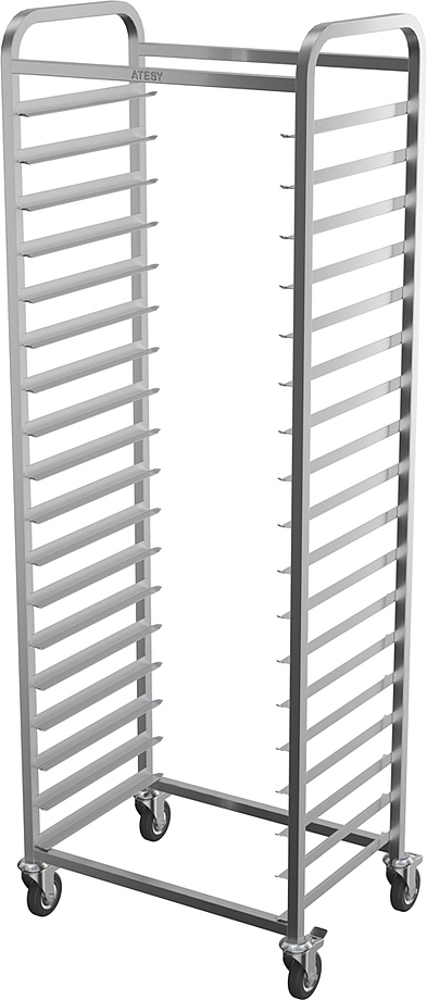 Тележка-шпилька ATESY КШ-С-1.18-470.580-02 серии Стандарт предназначается для временного хранения и перемещения гастроемкостей между линиями раздачи готовых блюд и кухней на предприятиях общественного питания, торговли и пищевых производствах. Тележка оснащена 4 поворотными колесами (2 с тормозами), кромками с безопасным подгибом. Тип конструкции - сварная, стойки из труб квадратного сечения. Материал конструкции - нержавеющая сталь AISI 304.