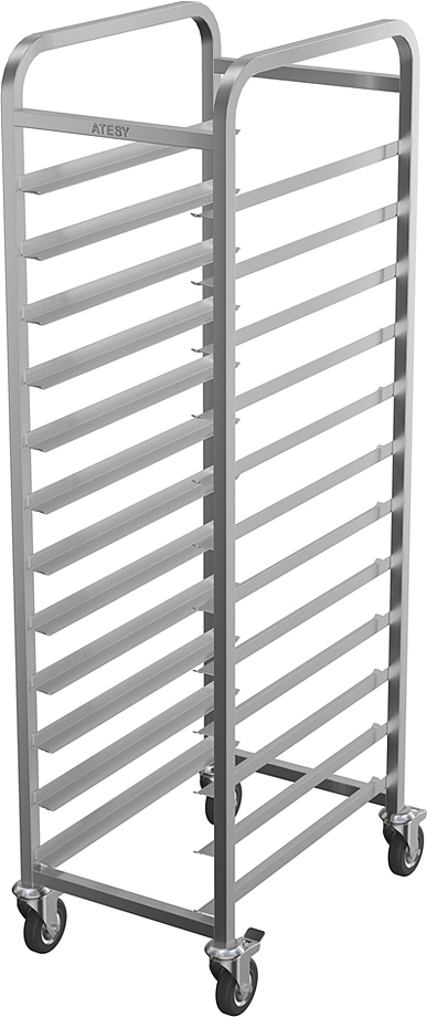 Тележка-шпилька ATESY КШ-С-1.12-470.580-02 серии Стандарт предназначается для временного хранения и перемещения гастроемкостей между линиями раздачи готовых блюд и кухней на предприятиях общественного питания, торговли и пищевых производствах. Тележка оснащена 4 поворотными колесами (2 с тормозами), кромками с безопасным подгибом. Тип конструкции - разборная, стойки из труб квадратного сечения. Материал конструкции - нержавеющая сталь AISI 304.
