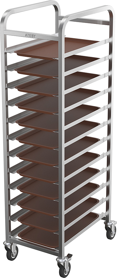Тележка-шпилька ATESY КШ-С-1.12-350.600-02 серии Стандарт предназначается для временного хранения и перемещения гастроемкостей между линиями раздачи готовых блюд и кухней на предприятиях общественного питания, торговли и пищевых производствах. Тележка оснащена 4 поворотными колесами (2 с тормозами), кромками с безопасным подгибом. Тип конструкции - разборная, стойки из труб квадратного сечения. Материал конструкции - нержавеющая сталь AISI 304.
