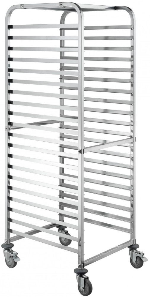 Тележка-шпилька REDGASTRO TR-20DL GN 2/1-20 используется на предприятиях общественного питания, торговли и пищевых производствах для перемещения подносов. Модель оснащена поворотными колесами, 2 из которых с тормозными механизмами диаметром 100 мм. Материал каркаса и решетчатых полок - высококачественная нержавеющая сталь AISI 201.