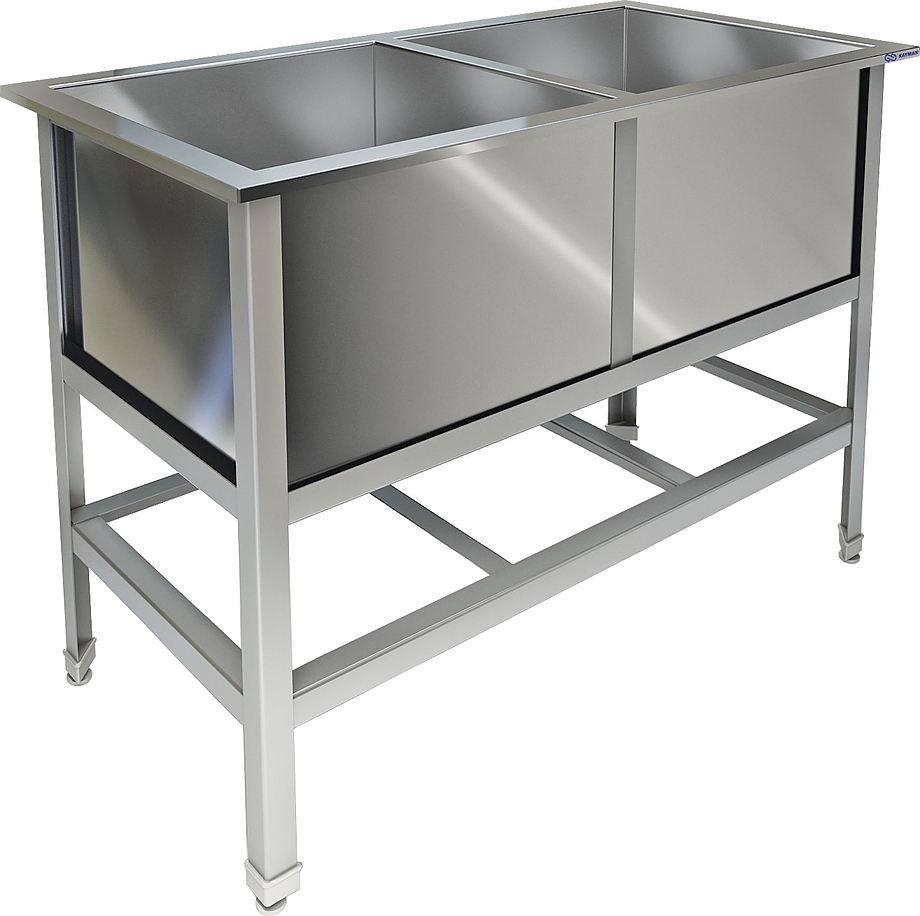 Моечная ванна используется на предприятиях общественного питания и торговли для мытья и ополаскивания продуктов, посуды и различного инвентаря. Модель с фартуком с 3 сторон, закругленными краями и шумопоглощающей изоляцией снизу моек оснащена обнижениями, которые препятствуют попаданию воды за пределы столешницы, и регулируемыми по высоте ножками, что позволяет компенсировать неровности пола. Сварной каркас выполнен из трубы из нержавеющей стали AISI 304, цельнотянутые мойки - из нержавеющей стали AISI 304 толщиной 1 мм, выпуски - из нержавеющей стали.