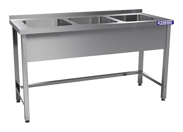Моечная ванна КАМИК ВМ-3-44207 используется на предприятиях общественного питания и торговли для мойки посуды, овощей и фруктов. Сварной каркас и столешница выполнены из нержавеющей стали AISI 430, цельнотянутая емкость - из нержавеющей стали AISI 304.