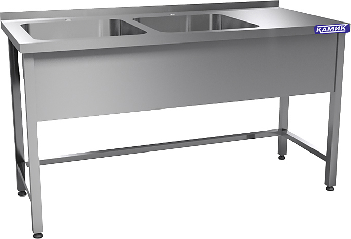 Моечная ванна КАМИК ВМ-2-44167 используется на предприятиях общественного питания и торговли для мойки посуды, овощей и фруктов. Сварной каркас и столешница выполнены из нержавеющей стали AISI 430, цельнотянутая емкость - из нержавеющей стали AISI 304.