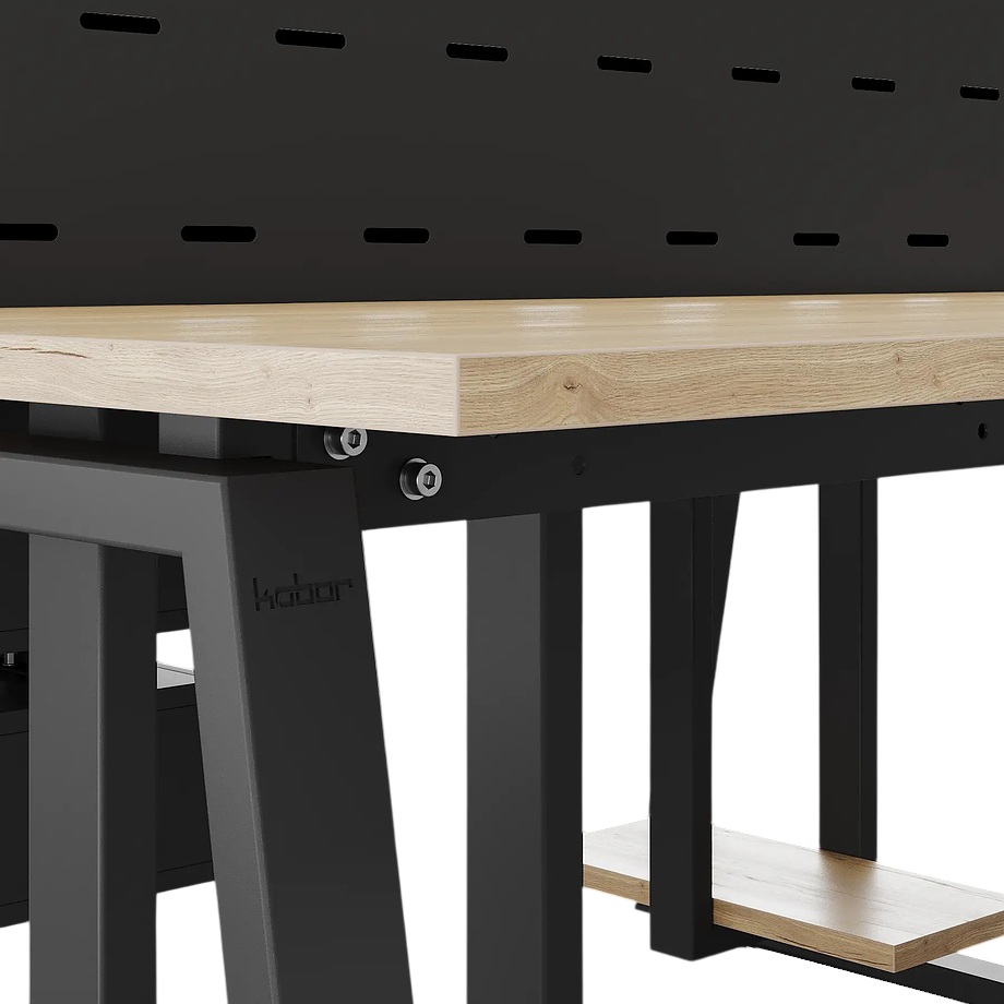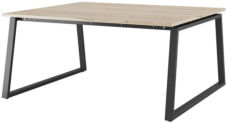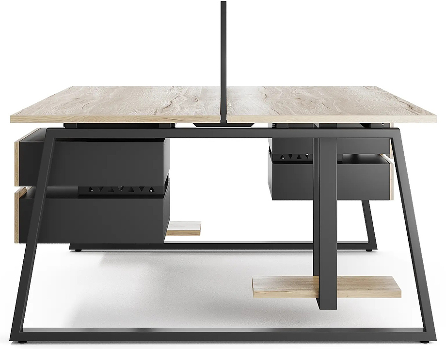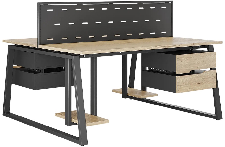 Офисный стол Кобор TR/2-140/140 black/natural предназначен для двух рабочих мест и идеально подходит для офисов и кабинетов руководителей. Модель оснащена опорами в форме трапеции. Материал столешницы - прочный ЛДСП толщиной 25 мм, усиленная снизу металлическим каркасом, материал опор и каркаса - окрашенный металл.