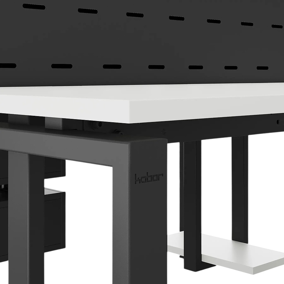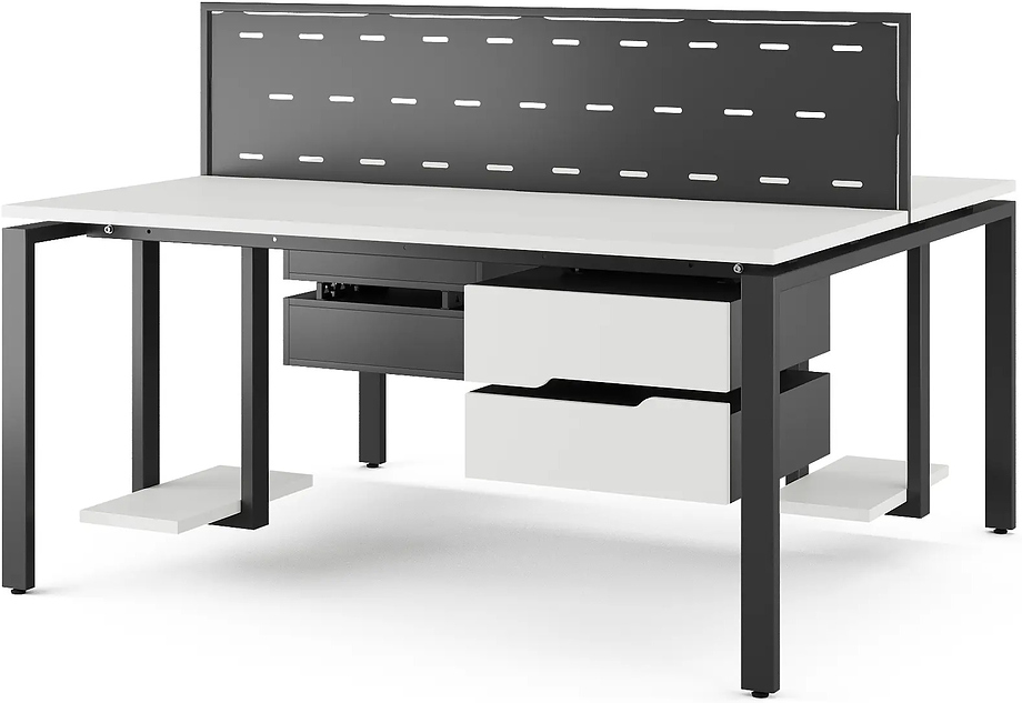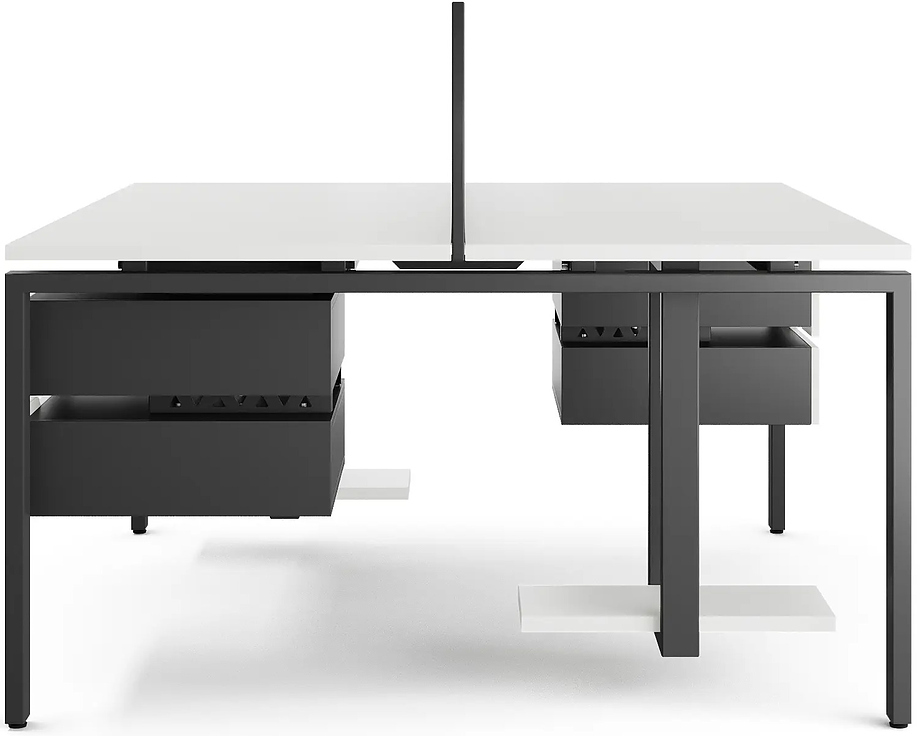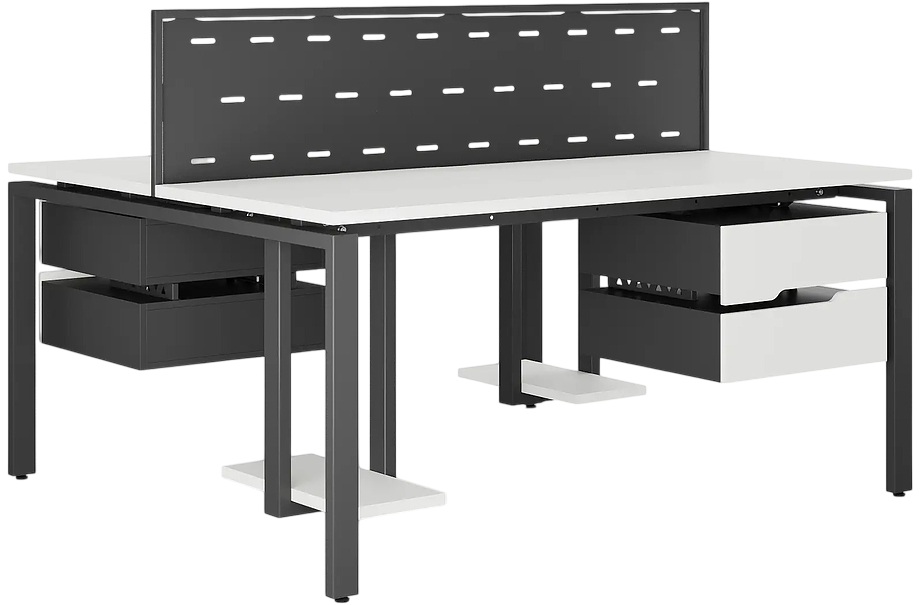 Офисный стол Кобор P/2-140/140 black/premium предназначен для двух рабочих мест и идеально подходит для офисов и кабинетов руководителей. Модель оснащена П-образными опорами. Материал столешницы - прочный ЛДСП толщиной 25 мм, усиленная снизу металлическим каркасом, материал опор и каркаса - окрашенный металл.