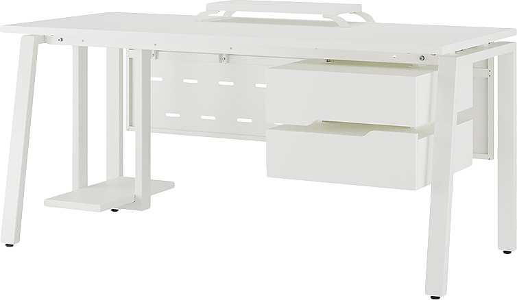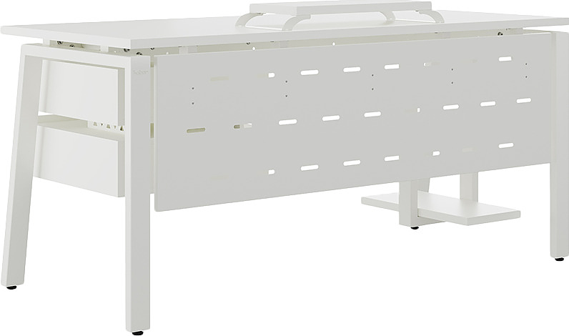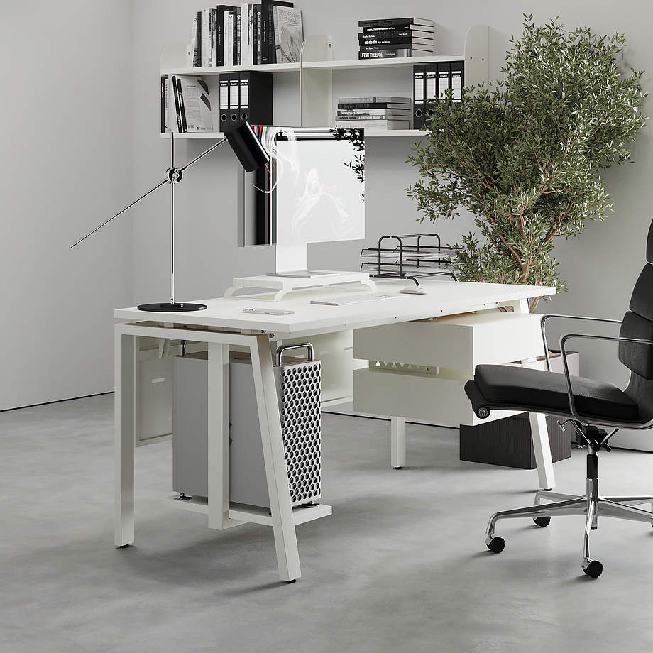 Офисный стол КОБОР AB-120/60 white/premium используется в офисных помещениях и кабинетах руководителей. Модель оснащена A-образными опорами со скошенными фронтальными сегментами. Материал столешницы - прочный ЛДСП толщиной 25 мм, усиленная снизу металлическим каркасом, материал опор и каркаса - окрашенный металл.