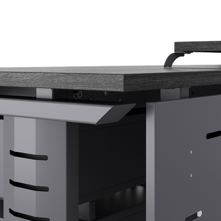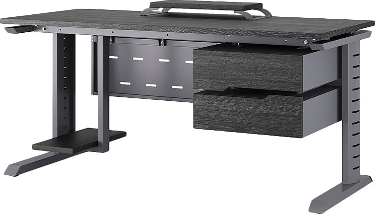 Офисный стол КОБОР L2-120/60 graphite/wood используется в офисных помещениях и кабинетах руководителей. Модель оснащена L-образными опорами с декоративной вставкой на боковинах. Материал столешницы - прочный ЛДСП толщиной 25 мм, усиленная снизу металлическим каркасом, материал опор - окрашенный металл.